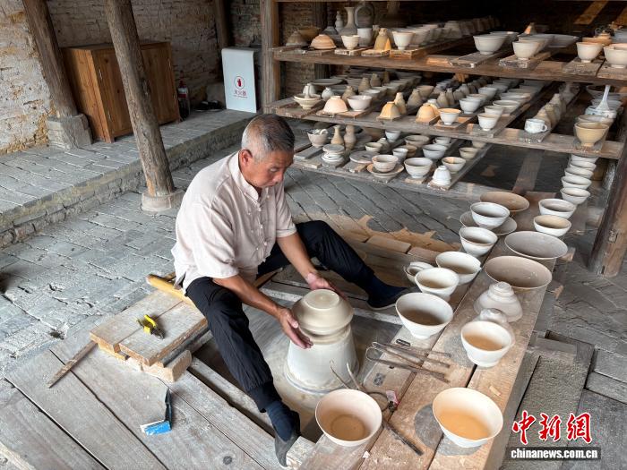 9月24日,在景德鎮(zhèn)陶陽(yáng)里歷史文化街區(qū)內(nèi),一位陶瓷匠人正在向游客展示修坯技藝。李韻涵 攝