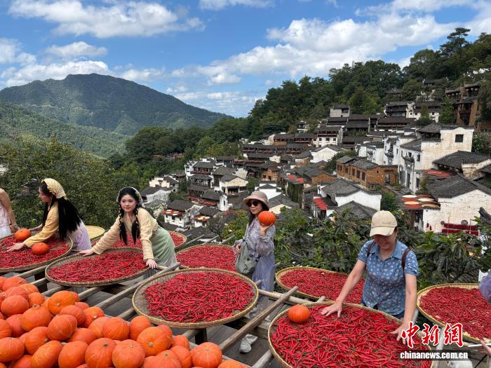 婺源篁嶺古村的秋季,正是最具煙火氣的時(shí)節(jié)。“地?zé)o三尺平”的地形讓民居在山崖上錯(cuò)落有致,房前屋后曬架上豐收的農(nóng)作物,意為“曬秋”,是中國(guó)農(nóng)耕文明中“秋收冬藏”重要一環(huán)。五彩斑斕的農(nóng)作物與白墻黛瓦的徽派建筑形成對(duì)比,構(gòu)成了一幅獨(dú)特的農(nóng)俗景觀(guān),吸引了海內(nèi)外無(wú)數(shù)游客紛至沓來(lái)。