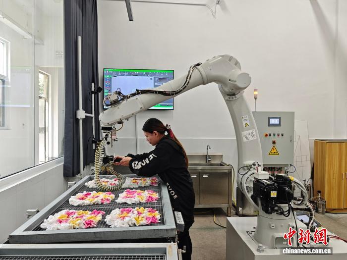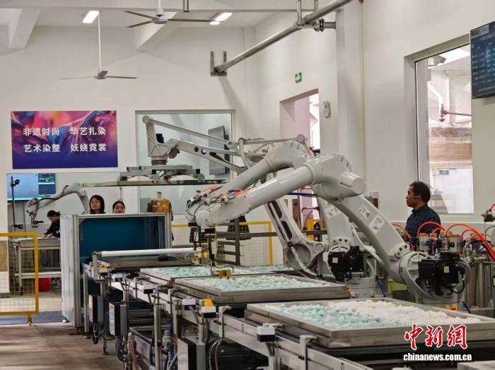 科技賦能帶來了顯著的產(chǎn)業(yè)變革。每條生產(chǎn)線上的“智能工匠”工作量堪比5名工人,可替代30%的扎染工序,將生產(chǎn)效率提升6倍;染料利用率從60%躍升至92%,正品率高達(dá)98%,同時(shí)大幅降低廢水排放,實(shí)現(xiàn)了經(jīng)濟(jì)效益與綠色發(fā)展的雙贏。